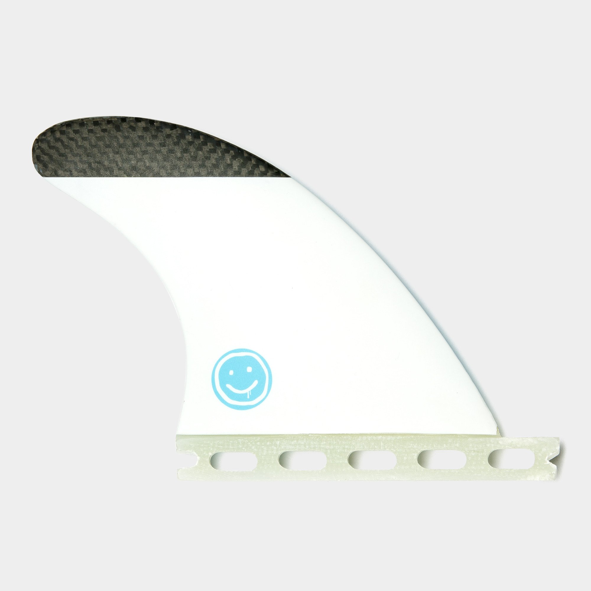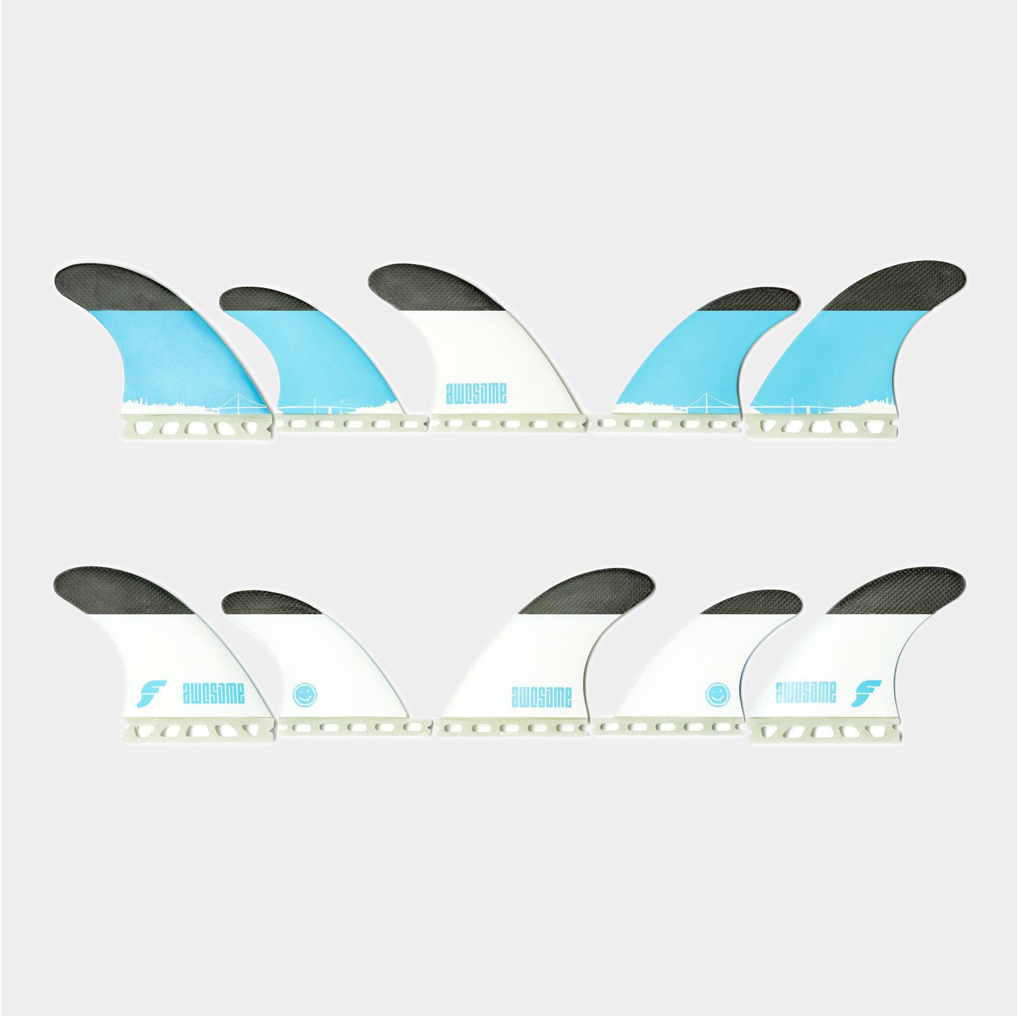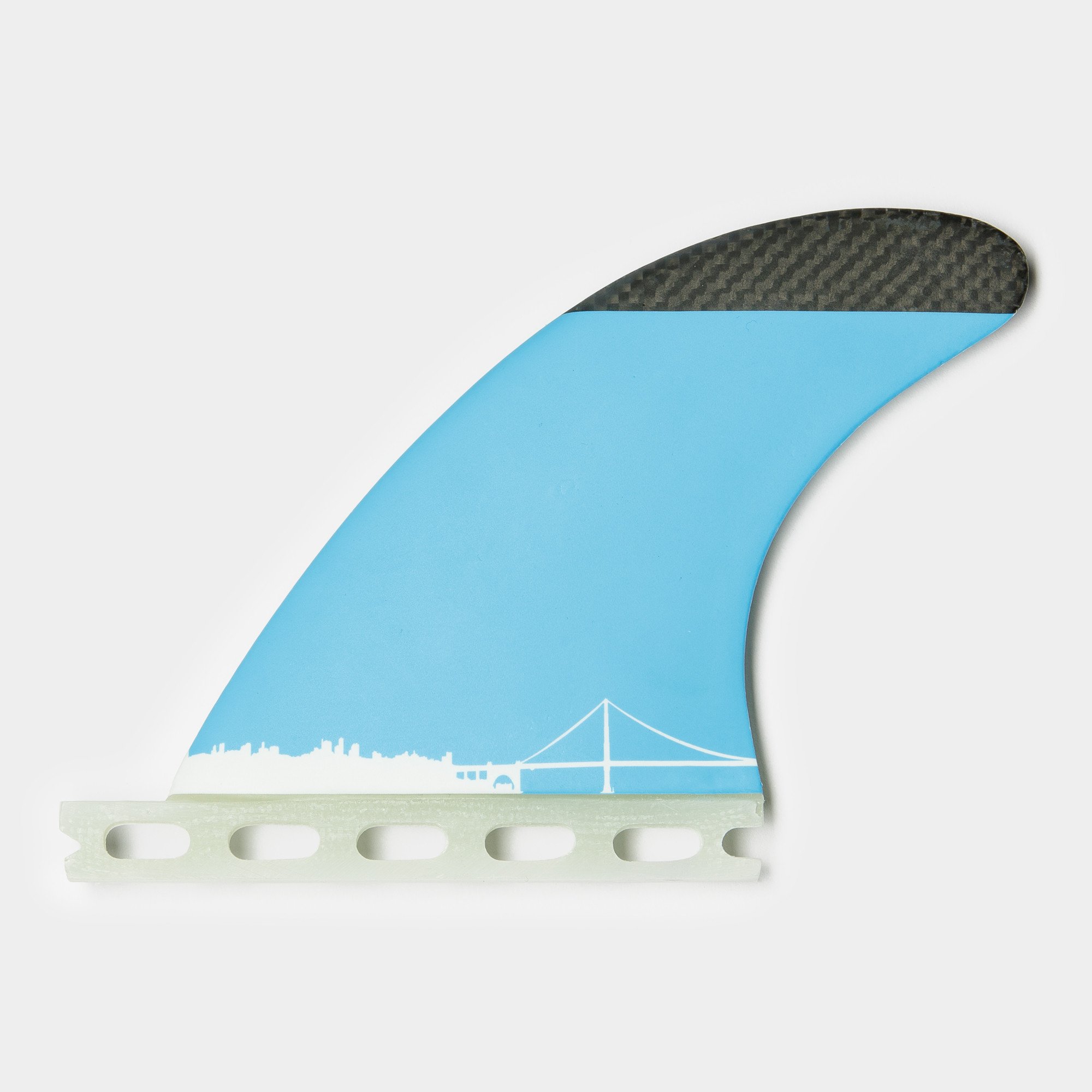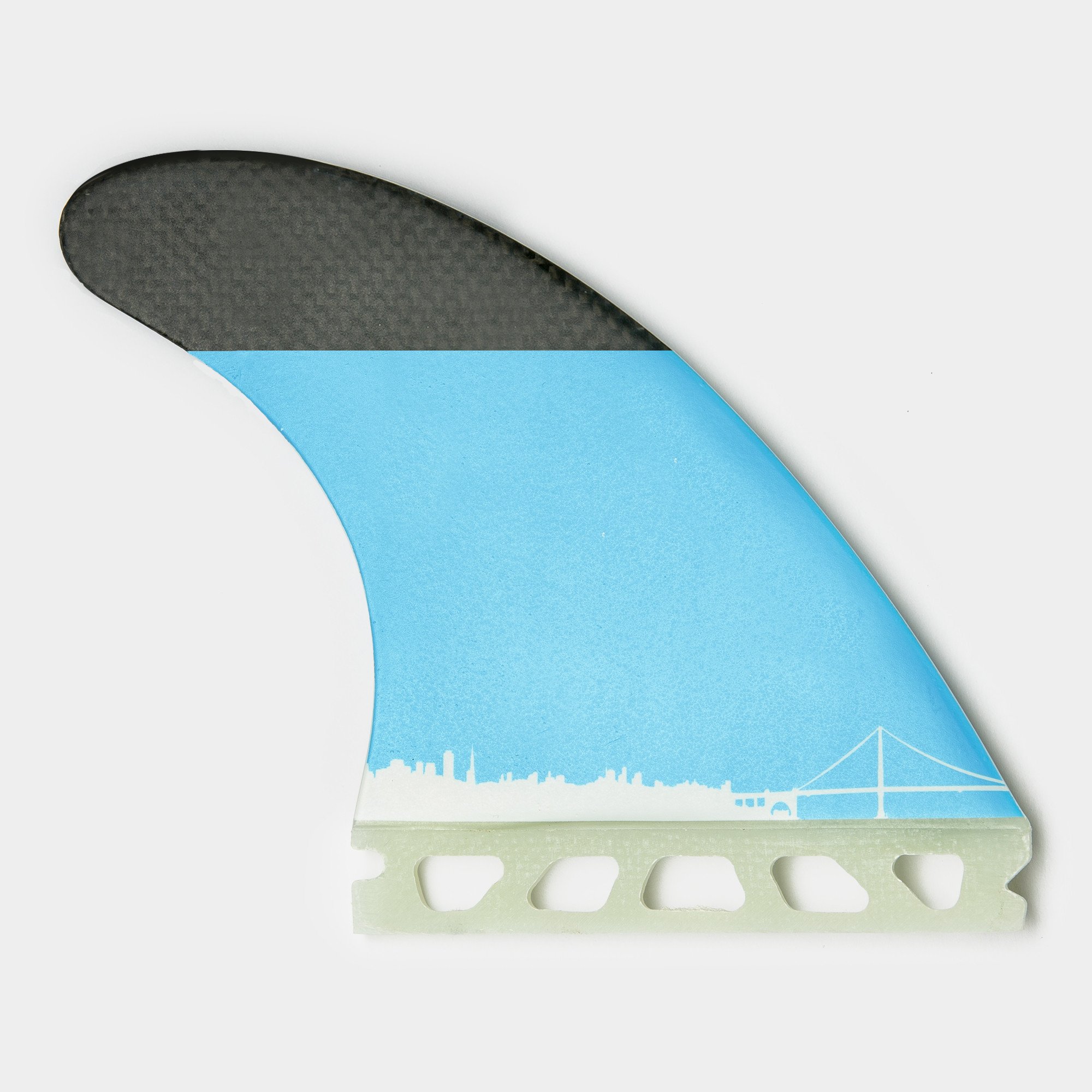 A very versatile thruster/quad set of fins geared towards surf in the small and medium range. The fin set has a balanced template, allowing it to perform in a variety of conditions. The option to switch between a thruster and quad setup lets you further dial in your fin configuration for the conditions at hand. Made with lightweight honeycomb cores, fiberglass, and 3K carbon fiber. The fin has a two tone design - white outside/blue inside, and shows the San Francisco skyline, spanned across side and quad rears.