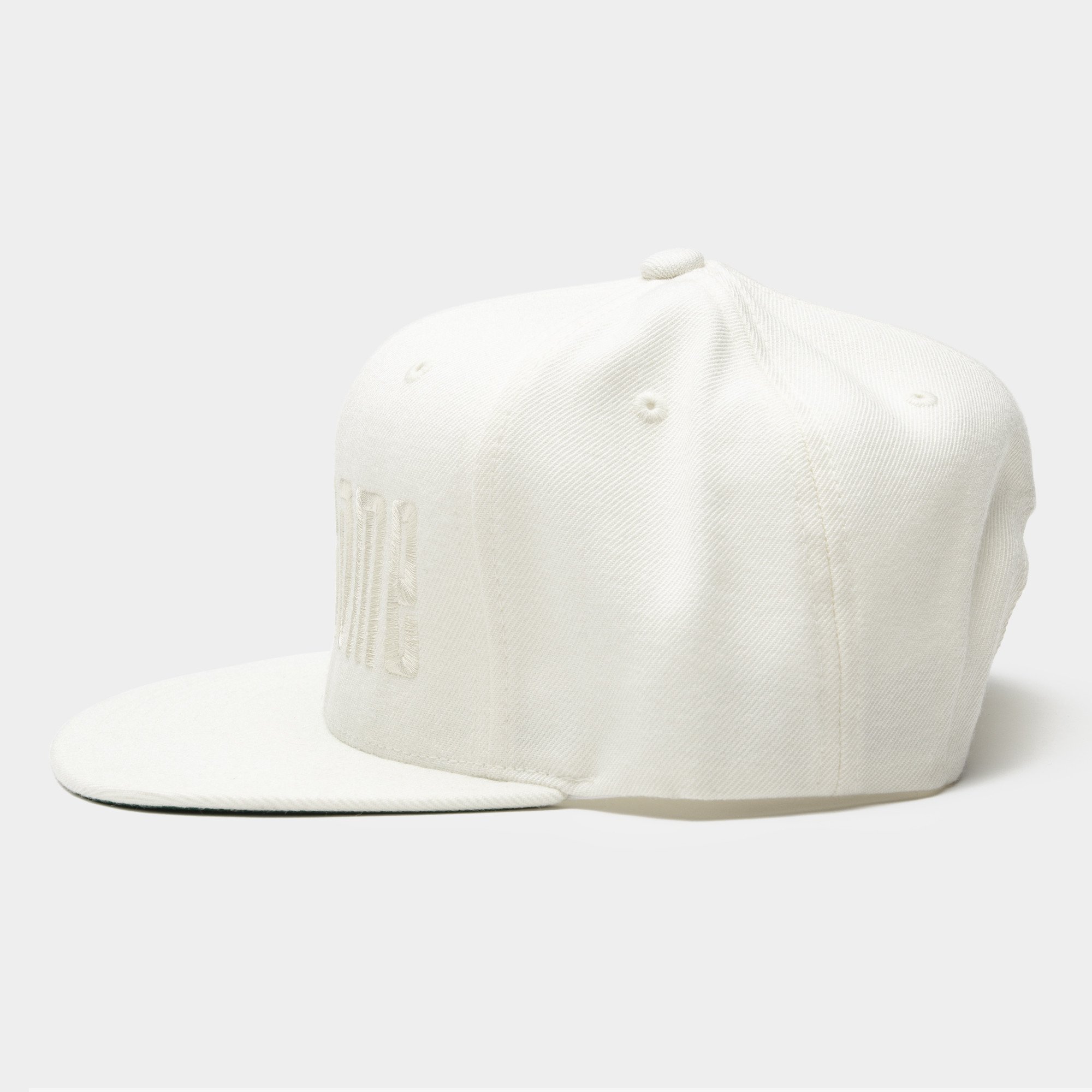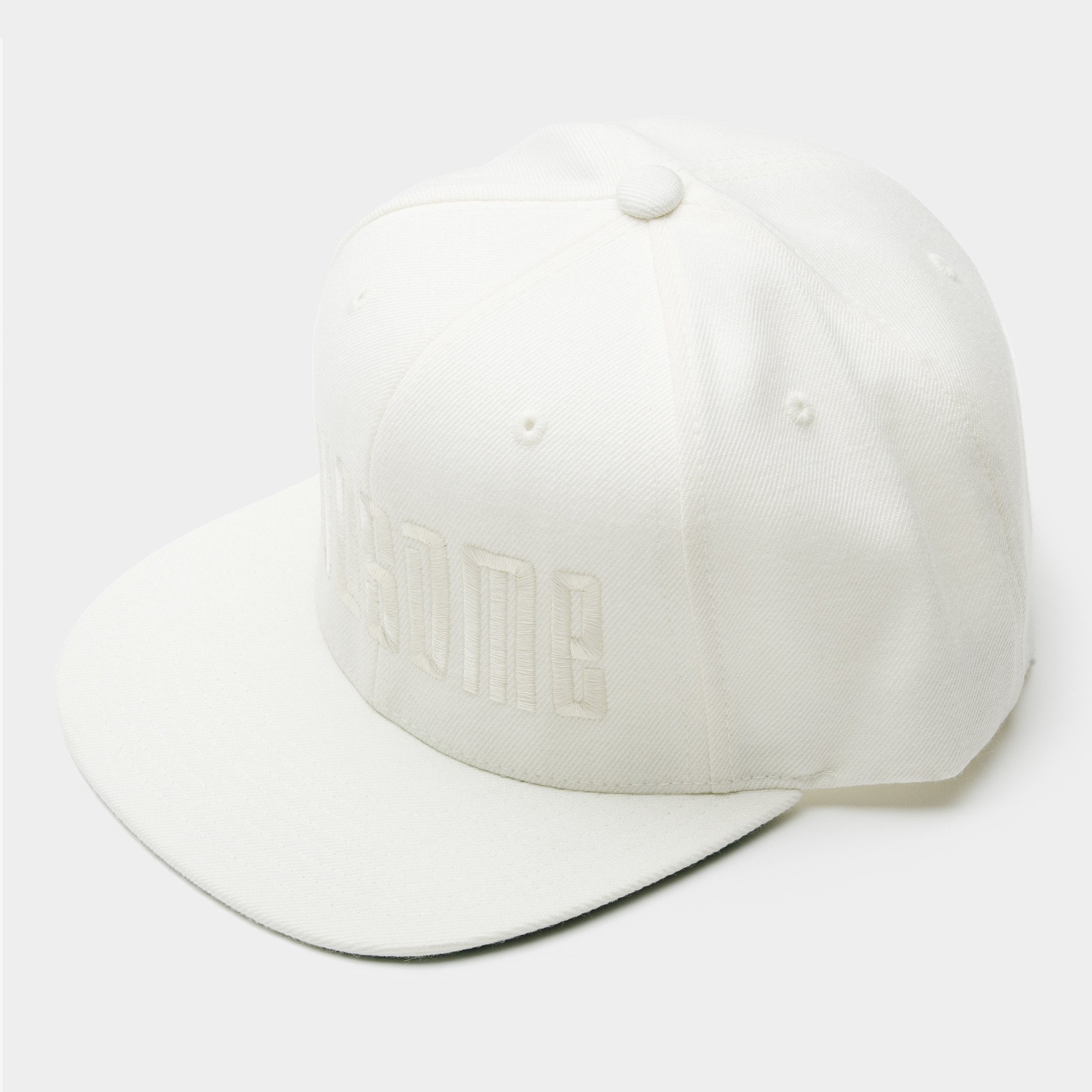 White 5 panel hat with large white Awesome logo embroidered on front.