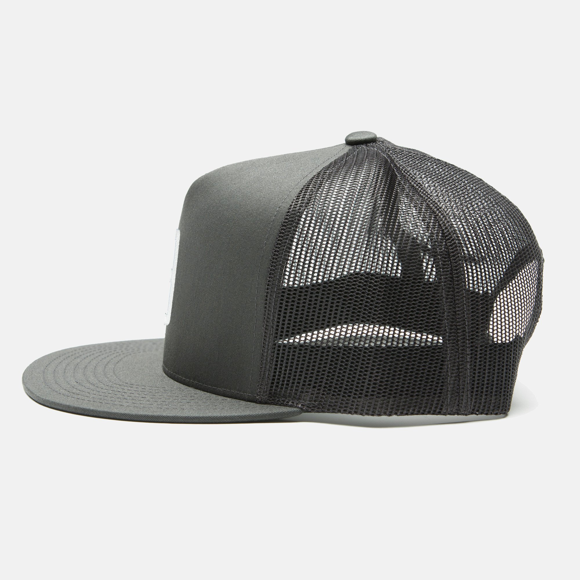 Grey 5 panel classic trucker hat with A embroidery on front.
